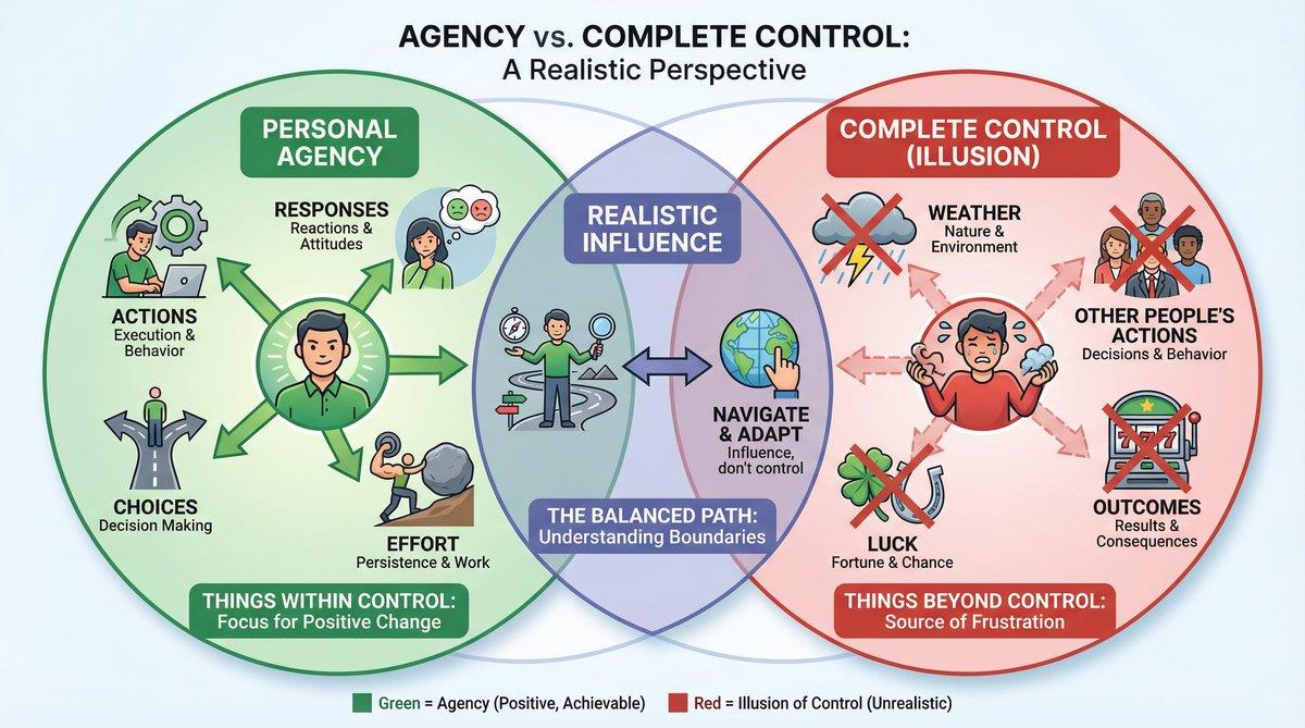 It is crucial to distinguish between personal agency and the illusion of complete control. Agency is about focusing on what you can influence—your thoughts, your effort, your responses. In contrast, the desire for complete control is an attempt to manage things outside your power, such as others’ reactions or external outcomes. This distinction is the difference between empowerment and frustration.